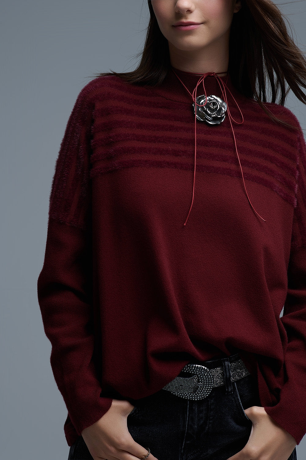 Camisola de gola alta descontraída com riscas texturadas em borgonha